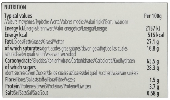 Ingredients: Flour Blend (Rice, Potato Starch, Maize, Stabilizer: Xanthan Gum), Butter (Milk) (26%), Sugar, Dark Chocolate Chips (12%) (Sugar, Cocoa Mass, Cocoa Butter, Emulsifier: Soya Lecithin, Natural Vanilla Flavoring), Salt