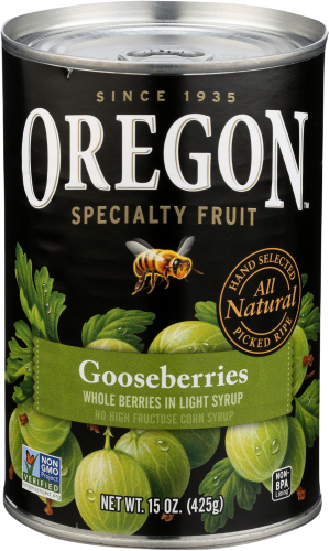 Oregon Gooseberries--How Tart They Are! Look inside this label for a fabulous recipe for Gooseberry Pie! You'll need: (2) crusts for a 9-inch pie, 2 cans Oregon Gooseberries, sugar, cornstarch, salt and butter. Check www.oregonfruit.com for more great ideas. If you have t a recipe of your own, please call us and share it!