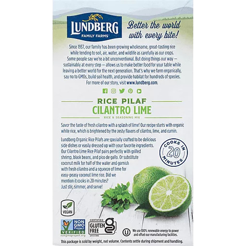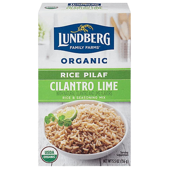 Lundberg Organic Rice Pilafs are specially crafted to be delicious side dishes or easily dressed up with your favorite ingredients. Our Cilantro Lime Rice Pilaf pairs perfectly with grilled shrimp, black beans, and pico de gallo.