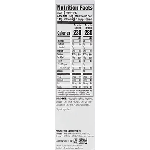 Ingredients: Parboiled White Rice, *Rice Flour, Sea Salt, *Cane Sugar, *Cilantro, *Lime Oil, *Rice Concentrate, Citric Acid, *Cumin, *Cilantro Oil.
