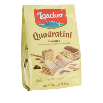 Our Tiramisù Quadratini combine the flavors of the most popular Italian dessert with the crunchiness of our Loacker wafers. The Tiramisù cream is made with 100% Arabica coffee roasted by an artisanal coffee roaster up in the mountains of South Tyrol/ Italy and cocoa from our Sustainable Farming program. This resealable bag contains 55 bite size premium wafer cookies filled with finest Tiramisù cream. Loacker Quadratini are ideal for sharing with friends and loved ones or perfect to enjoy by yourself with a cup of coffee or a glass of milk.