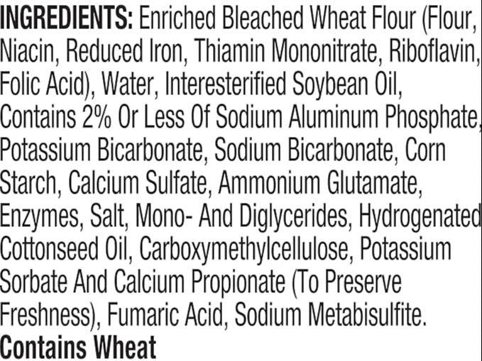Ingredients: Enriched Bleached Wheat Flour (Flour, Niacin, Iron, Thiamin Mononitrate, Riboflavin, Folic Acid), Water, Interesterified Soybean Oil, Contains 2% or Less of: Sodium Aluminum Phosphate, Potassium Bicarbonate, Sodium Bicarbonate, Corn Starch, Calcium Sulfate, Ammonium Glutamate, Enzymes, Salt, Mono- and Diglycerides, Hydrogenated Cottonseed Oil, Carboxymethylcellulose, Potassium Sorbate and Calcium Propionate (to Preserve Freshness), Fumaric Acid, Sodium Metabisulfite.