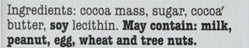 Ingredients: Cocoa Mass, Sugar, Cocoa Butter, Soy Lecithin