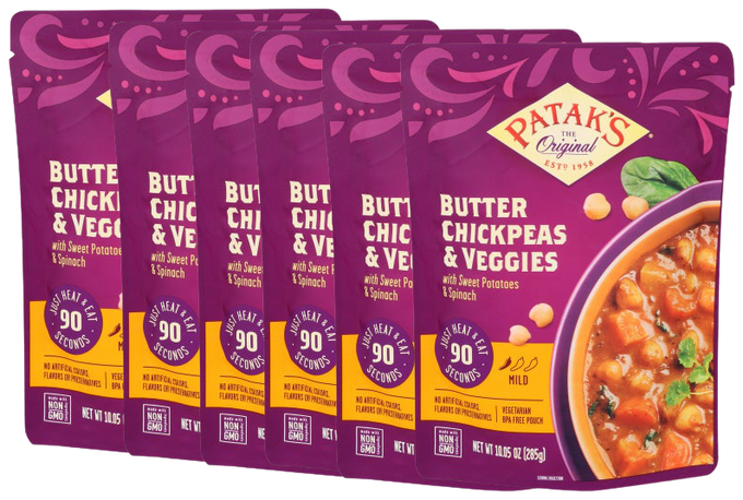 Patak's® Butter Chickpeas & Veggies is a vegetarian twist on a traditional Butter Chicken dish. This flavorful, mild curry is made with chickpeas, spinach, carrots, and a balanced melody of other veggies. Perfect as a quick meal or delicious side, great as an individual serving or can be shared. Simply heat, eat, and enjoy on its own, with naan bread or rice.