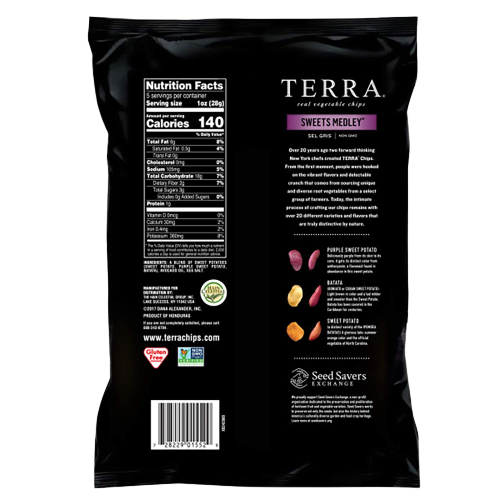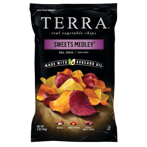Terra is not just your regular snacking chip, but rather a unique , gluten-free, real vegetable chip experience. Every vegetable is hand picked, prepared in small batches, and packaged in distinctive black Terra bags.