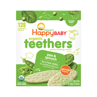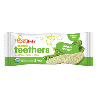 Made with jasmine rice flour and a touch of organic fruits and veggies, our pea & spinach teething wafers dissolve easily, making them a perfect first snack for baby’s developing gums.