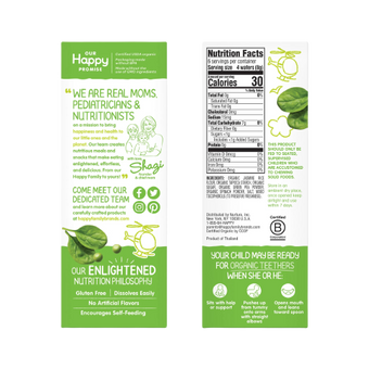 Ingredients: Organic Jasmine Rice Flour, Organic Tapioca Starch, Organic Sugar, Organic Green Pea Powder, Organic Spinach Powder,Salt, Mixed Tocopherols (To Preserve Freshness).