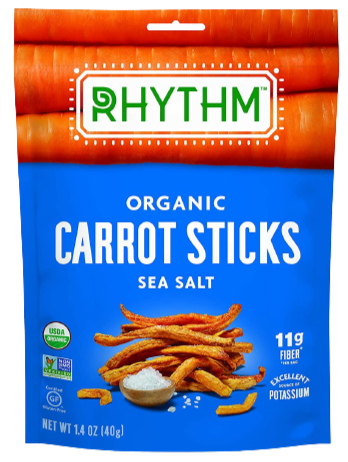 Ingredients: Rhythm Superfoods - Organic Carrot Sticks Sea Salt - 1.4 Oz. Nutrition Facts Serving Size: 1 Bag (40G) Servings Per Container: 1 Amount Per Serving %Dv Calories 150 Total Fat 2.5G 3% Saturated Fat 0G 0% Trans Fat 0G Cholesterol 0Mg 0% Sodium 310Mg 13% Total Carbohydrate 28G 10% Dietary Fiber 11G 38% Total Sugars 6G Includes 0G Added Sugars 0% Protein 3G Vitamin