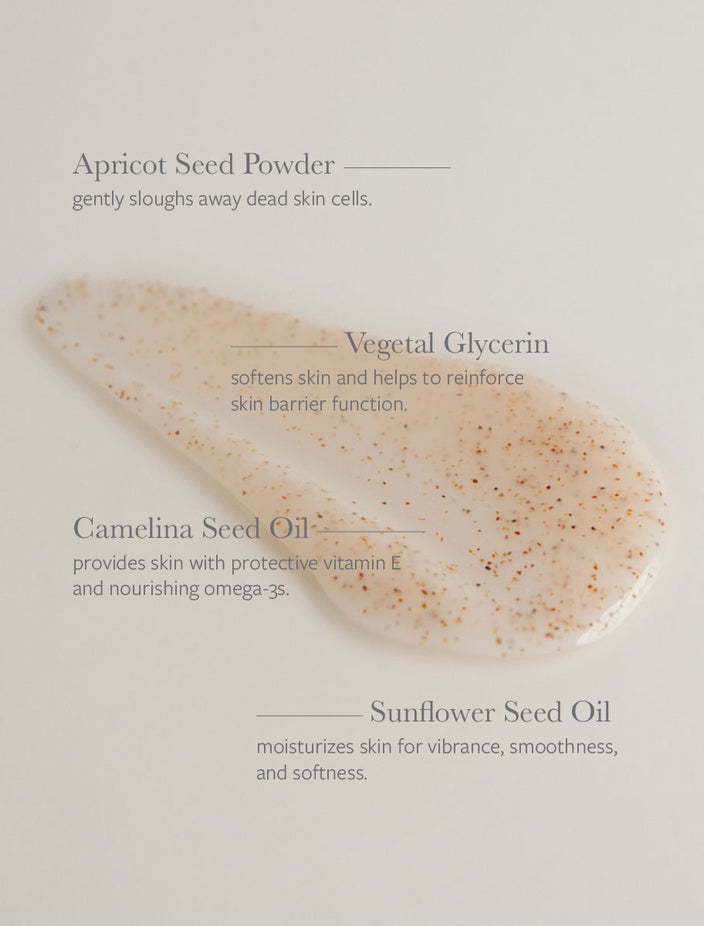 Ingredients: Water (Aqua), Sodium Laurylglucosides Hydroxypropylsulfonate (Coconut), Glycerin (Vegetable), Sodium Methyl Cocoyl Taurate (Coconut), Cocamidopropyl Hydroxysultaine (Coconut), Glyceryl Stearate Se (Coconut), Sodium Lauryl Glucose Carboxylate (Sugar/Coconut), Prunus Armeniaca (Apricot) Seed Powder, Cetearyl Alcohol (Mixed Plants), Helianthus Annuus (Sunflower) Seed Oil, Camelina Sativa (Camelina) Seed Oil, Hydrolyzed Quinoa, Lauryl Glucoside (Sugar), Xanthan Gum (Sugar), Carrageenan (Seaweed), Fragrance (All Natural), Gluconolactone (Glucose Syrup), Potassium Sorbate*, Sodium Benzoate*, Citric Acid.