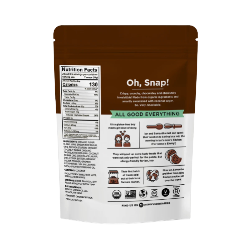 Ingredients: Organic Flour Blend (Org. Brown Rice Flour, Org. Tapioca Starch), Organic Coconut Sugar, Organic Chocolate Chips (Org. Coconut Sugar, Org. Chocolate Liquor, Org. Cocoa Butter), Organic Cocoa Powder, Organic Coconut Oil, Sea Salt, Bakign Soda, Organic Peppermint Oil.
