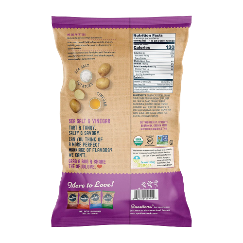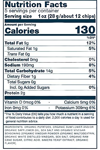 Ingredients: Organic Potatoes, Organic Sunflower And/Or Organic Safflower Oil, Sea Salt And Organic Vinegar Seasoning [Organic Vinegar Powder (Organic Maltodextrin, Organic White Distilled Vinegar), Sea Salt, Organic Raw Cane Sugar, Citric Acid, Bakers Yeast Extract, Organic Flavor].