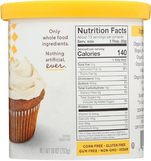 Ingredients: Organic Palm Shortening* Organic Powdered Sugar Organic Coconut Oil* Organic Tapioca Starch Vanilla Extract Organic Rosemary Extract (For Freshness) Sea Salt Monk Fruit Extract