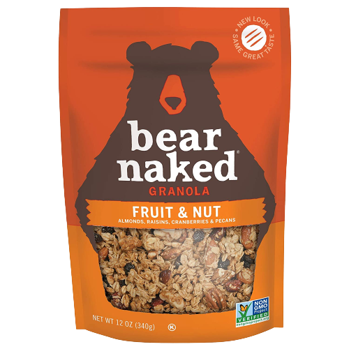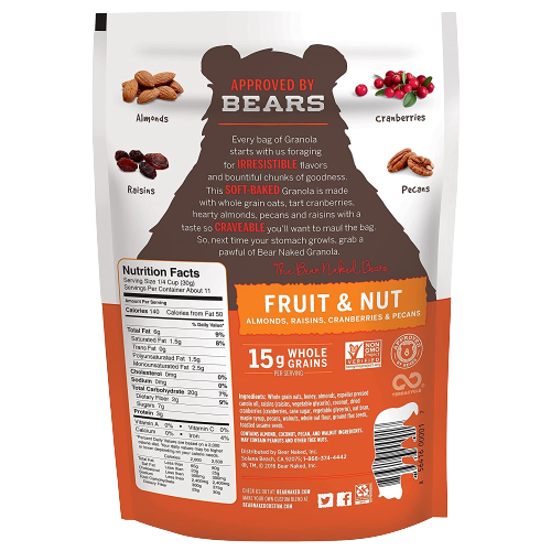 Need help finding fruits and nuts in nature? There's no better guide than a bear. Want a companion to share their Fruit & Nut Granola, with Non-GMO Project Verified almonds, raisins, coconut, dried cranberries, pecans and walnuts? You should probably ask a human… or you can save it for yourself, the bear definitely won’t judge. A delicious blend of whole grain oats, hearty almonds, luscious raisins, dried cranberries, pecans and walnuts. Bear Naked Fruit and Nut Granola is a tasty way to start your day. 30 grams of whole grains per 60 gram serving; Non-GMO Project Verified and Kosher OK Pareve. Take-anywhere resealable pouch makes for the perfect portable healthy snack; Bowl it, palm it, bag it.