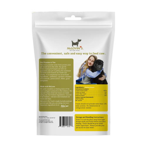 At McLovin's Pet, our freeze-dried treats are made using only the freshest ingredients, sourced from farmers, ranchers and fishermen we know and trust. McLovin's never adds hormones, antibiotics or anything artificial. Our science-based approach to premium, biologically appropriate raw nutrition supports your pet's overall health and well-being. McLovin's Pet Food is made by dedicated pet parents just like you who provide the most important ingredient of all, McLove!
