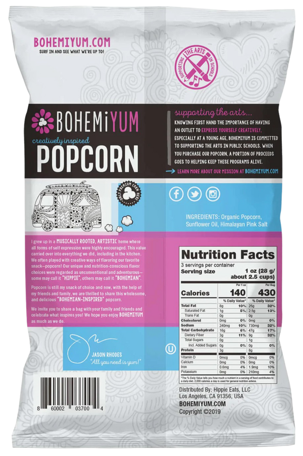 Ingredients: Organic Popcorn, Sunflower Oil, Himalayan Pink Salt