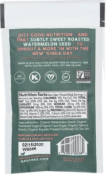 Ingredients: Organic Watermelon Seeds, Organic Powdered Sugar (Organic Cane Sugar, Organic Tapioca Starch), Organic Expeller Pressed Sunflower Oil, Sea Salt.