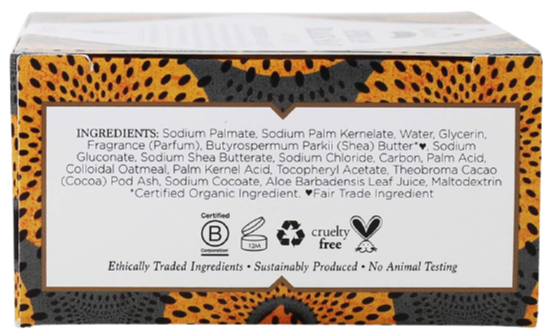 Ingredients: Sodium Palmate, Sodium Kernelate, Water, Glycerin, Fragrance (Parfum), Butyrospermum Parkii (Shea) Butter*?, Sodium Gluconate, Sodium Shea Butterate, Sodium Chloride, Carbon, Palm Acid, Colloidal Oatmeal, Palm Kernel Acid, Tocopheryl Acetate, Theobroma Cacao (Cocoa) Pod Ash, Sodium Cocoate, Aloe Barbadensis Leaf Juice, Maltodextrin