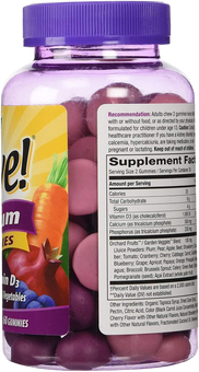 Ingredients: Vitamin D3 (As Cholecalciferol) 1,000 Iu,calcium (As Tricalcium Phosphate) 500 Mg,phosphorus (As Tricalcium Phosphate) 230 Mg, Orchard Fruits / Garden Veggies Blend 100 Mg:(Juice Powders: Plum; Pear; Apple; Beet; Strawberry; Cucumber;tomato; Cranberry; Cherry; Cabbage; Carrot; Cauliflower;blueberry; Grape; Apricot; Papaya; Orange; Pineapple; Asparagus;broccoli; Brussels Sprout; Celery; Green Bean; Spinach);pomegranate (Seed); A?a' Extract (Whole Palm Fruit) Other Ingredients: Organic Tapioca Syrup, Dried Cane Syrup, Pectin, Citric Acid, Color From Natural Source (Black Carrot Juice Concentrate), Natural Flavors (Cherry And Strawberry), Fractionated Coconut Oil, Beeswax.