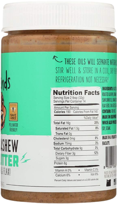 Ingredients: Roasted Almonds, Roasted Cashews, Organic Sunflower Oil, Organic Clover Honey, Chia Seeds, Flax Seeds, Sea Salt