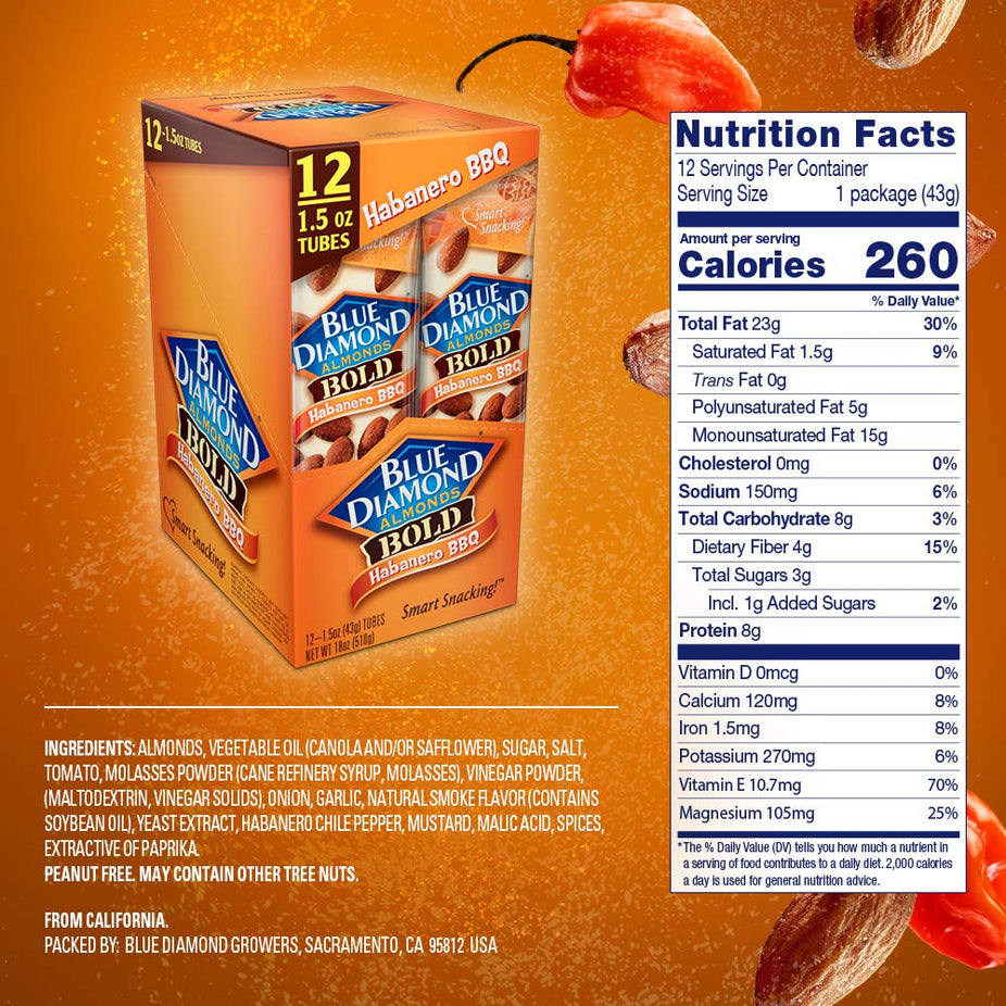 Blue Diamond Almond Habanero BBQ packs the perfect punch of smoky barbecue flavor with a kick of fiery habanero spice.