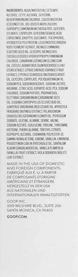 Ingredients: Aqua/Water/Eau, Cetearyl Alcohol, Cetyl Alcohol, Glycerin, Behentrimonium Chloride, Cocos Nucifera (Coconut) Oil, Bis-(Isostearoyl/Oleoyl Isopropyl) Dimonium Methosulfate, Glyceryl Stearate, Capryloyl Glycerin/Sebacic Acid Copolymer, Diheptyl Succinate, Tocopherol, Hydrolyzed Pea Protein, Leuconostoc/Radish Root Ferment Filtrate, Ricinus Communis (Castor) Seed Oil, Glyceryl Ricinoleate, Cocoglucosides Hydroxypropyltrimonium Chloride, Canarium Luzonicum (Elemi) Gum Oil, Cistus Ladaniferus (Gum Rockrose) Leaf/Stem Extract, Citrus Sinensis (Orange) Fruit Extract, Cyperus Scariosus (Nutgrass) Root Oil, Glyceryl Caprylate, Polyquaternium-10, Sodium Pca, Sodium Benzoate, Sodium Lactate, Arginine, Citric Acid, Aspartic Acid, Pca, Sodium Chloride, Sodium Phytate, Propanediol, Elettaria Cardamomum (Cardamom) Seed Oil, Eugenia Caryophyllus (Clove) Bud Oil, Juniperus Virginiana (Red Cedar) Oil, Myristica Fragrans (Nutmeg) Extract, Pelargonium Graveolens (Geranium) Flower Oil, Potassium Sorbate, Glycine, Alanine, Serine, Valine, Sodium Acetate, Isoleucine, Proline, Threonine, Histidine, Phenylalanine, Triethyl Citrate, Isopropyl Alcohol, Coumarin, Polyester-37, Gamma-nonalactone, Ionone, Vanillin, Limonene, Pogostemon Cablin (Patchouli) Oil, Santalum Album (Sandalwood) Oil, Vanilla Planifolia (Vanilla) Fruit Extract, Viola Odorata (Violet) Leaf Extract.