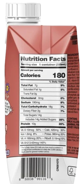 Ingredients: Water, sugar, animal-free whey protein (from fermentation), sunflower oil, alkalized cocoa, less than 1% of: vitamin A, vitamin D2, vitamin B12 (cyanocobalamin), riboflavin, citrus fiber, vanilla extract, salt, dipotassium phosphate, acacia, gellan gum, mixed tocopherols (antioxidant), calcium potassium phosphate citrate, natural flavor.