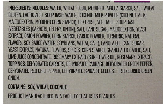 Ingredients: Noodles: Water, Wheat Flour, Modified Tapioca Starch, Salt, Wheat Gluten, Lactic Acid. Soup Base: Water, Coconut Milk Powder (Coconut Milk, Maltodextrin, Modified Corn Starch), Dextrose, Vegetable Soup Base (Vegetables [Carrots, Celery, Onion], Salt, Cane Sugar, Maltodextrin, Yeast Extract, Onion Powder, Corn Starch, Garlic Powder, Turmeric, Natural Flavor), Soy Sauce (Water, Soybeans, Wheat, Salt), Canola Oil, Cane Sugar, Yeast Extract, Natural Flavors, Spices, Corn Starch, Granulated Garlic, Salt, Lime Juice Concentrate, Rosemary Extract (Sunflower Oil, Rosemary Extract). Toppings: Dehydrated Carrots, Dehydrated Cabbage, Dehydrated Green Pepper, Dehydrated Red Chili Pepper, Dehydrated Spinach, Glucose Freeze Dried Green Onion.