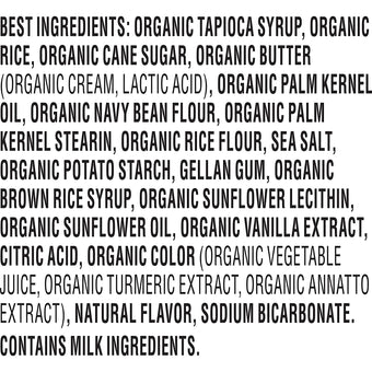 Ingredients: Organic Tapioca Syrup, Organic Rice, Organic Cane Sugar, Organic Quinoa Crisps, Organic Butter (Cream, Lactic Acid), Organic Navy Bean Flour, Sea Salt, Gellan Gum, Organic Brown Rice Syrup, Organic Vanilla Extract, Natural Flavor.