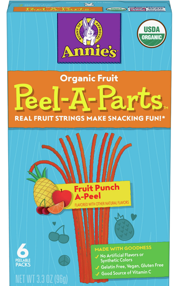 Annie’s Organic Fruit Punch A-Peel Peel A-Parts are a delicious snack that are as fun to play with as they are to eat. No artificial flavors, synthetic colors or high-fructose corn syrup here – just deliciously juicy bites of vegan and gluten free goodness.