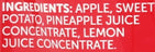 Ingredients: Apple, Sweet Potato, Pineapple Juice Concentrate, Lemon Juice Concentrate.