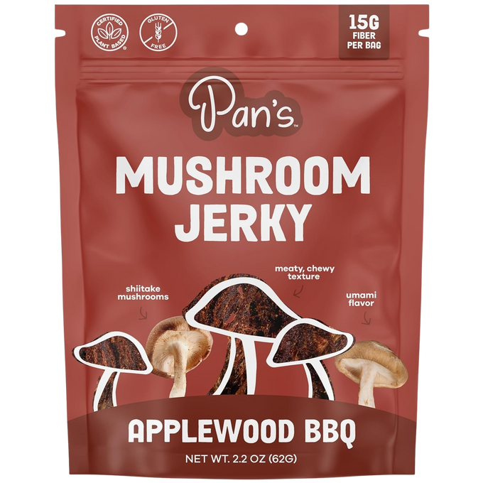 Enjoy Pan's Applewood BBQ Mushroom Jerky in 2.2 oz bags or convenient bundles for all your snacking needs.