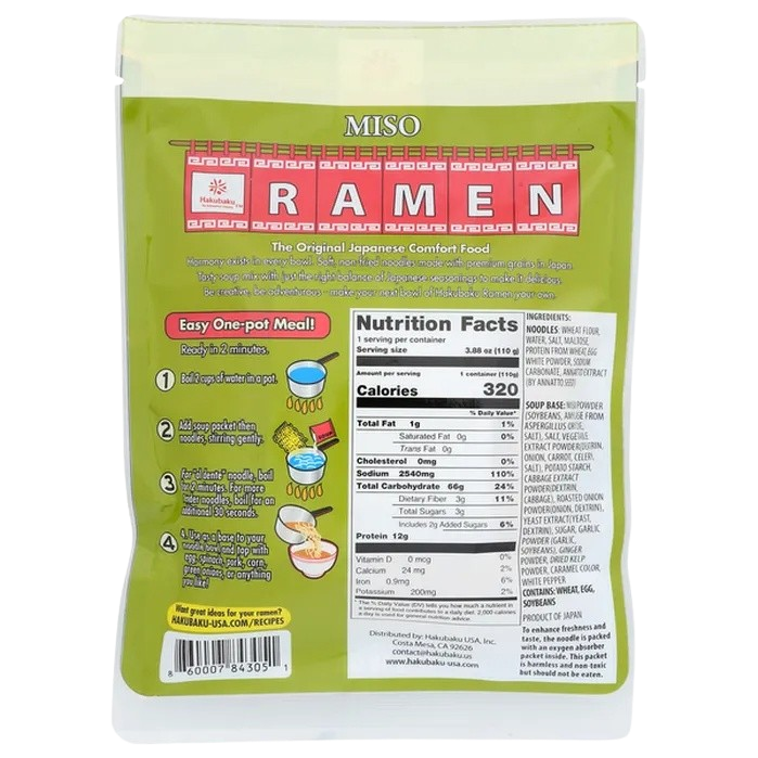 Ingredients: Noodles: Wheat Flour, Water, Salt, Maltose, Protein From Wheat, Egg White Powder, Sodium Carbonate, Annatto Extract (by Annatto Seed) Soup Base: Miso Powder (soybeans, Amylase From Aspergillus Oryzae, Salt), Salt, Vegetable Extract Powder(dextrin, Onion, Carrot, Celery, Salt), Potato Starch, Cabbage Extract Powder(dextrin, Cabbage), Roasted Onion Powder(onion, Dextrin), Yeast Extract (yeast, Dextrin), Sugar, Garlic Powder (garlic, Soybeans), Ginger Powder, Dried Kelp Powder, Caramel Color, White Pepper .