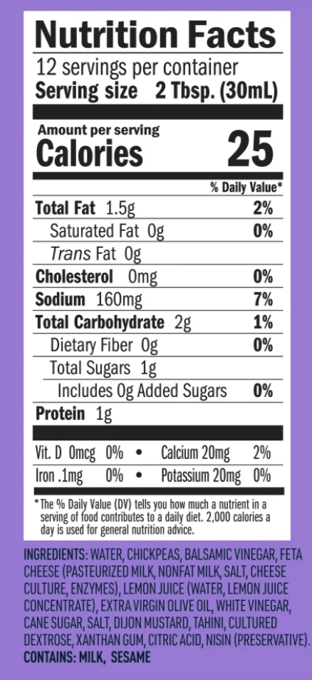 Ingredients: Water, Chickpeas, Balsamic Vinegar, Feta Cheese (Pasteurized Milk, Nonfat Milk, Salt, Cheese Culture, Enzymes), Lemon Juice (Water, Lemon Juice Concentrate), Extra Virgin Olive Oil, White Vinegar, Cane Sugar, Salt, Dijon Mustard, Tahini, Cultured Dextrose, Xanthan Gum, Citric Acid, Nisin (Preservative). Contains: Milk, Sesame