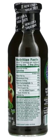 Ingredients: Water, Balsamic Vinegar (Wine Vinegar, Concentrated Grape Must, Caramel Color)†, Erythritol, Salt, Organic White Vinegar, Organic Dijon Mustard (Water, Organic Mustard Seed, Organic Vinegar, Salt, Organic Turmeric, Organic Spices), Onion Puree, Caramel Color, Xanthan Gum, Propylene Glycol Alginate, Garlic Puree, Sodium Citrate, Natural Flavor, Gellan Gum, Black Pepper, Sea Salt, Oregano, Basil, Stevia Reb M.