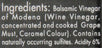 Ingredients: Wine Vinegar, Concentrated And Cooked Grape Must. Contains Naturally Occurring Sulfites. Acidity 6%