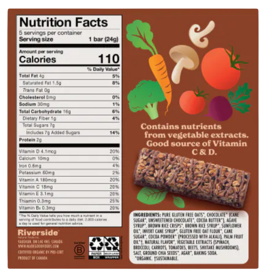 Ingredients: Pure Gluten Free Oats*, Chocolate* (Cane Sugar*, Unsweetened Chocolate*, Cocoa Butter*), Agave Syrup*, Brown Rice Crisps*, Brown Rice Syrup*, Sunflower Oil*, Oat Flour*, Cane Sugar*, Cocoa Powder* (Processed With Alkali), Palm Fruit Oil*†, Natural Flavor*, Vegetable Extracts (Spinach, Broccoli, Carrots, Tomatoes, Beets, Shiitake Mushrooms), Salt, Ground Chia Seeds*, Agar*, Baking Soda.