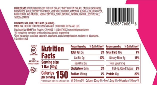 Ingredients: Protein Blend (Soy Protein Isolate, Whey Protein Isolate, Calcium Caseinate), Brown Rice Syrup, Chicory Root Fiber, Vegetable Glycerin, Almonds, Sugar, Alkalized Cocoa, Palm Kernel And Palm Oil, Nonfat Dry Milk, Sunflower Oil, Natural Flavor, Lecithin, Salt, Tapioca Starch.