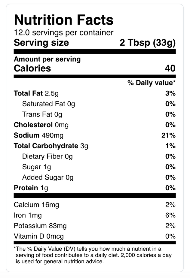 Ingredients: Water, Apple Cider Vinegar, Canola Oil, Garlic Powder, Tapatio Seasoning (Salt, Spices, Paprika, Dehydrated Garlic, Citric Acid, Vinegar Powder [Maltodextrin and White Distilled Vinegar], Rice Concentrate, Malic Acid Extractives of Paprika), Distilled Vinegar, Tomato Paste, Chipotle Sauce (Chipotle Peppers, Water, Tomato Puree, Vinegar, Salt, Sugar, Garlic and Canola Oil), Salt, Ancho Chili Pepper, Less than 2% of: Guajillo Chili Pepper, Lime Juice Concentrate, Spices, Modified Food Starch, Onion Powder, Xanthan Gum.