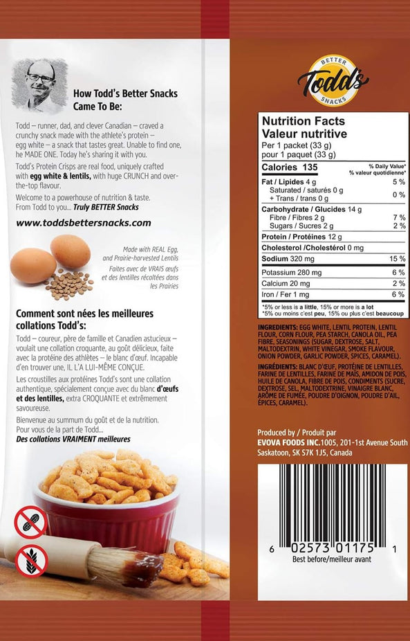 Todd's Better Snacks is dedicated to creating bold, protein-packed snacks that are as nourishing as they are delicious. Todd's Better Snacks BBQ Egg & Lentil Crisps deliver a smoky, savory crunch made from real egg whites and lentils for a better-for-you snacking experience.
