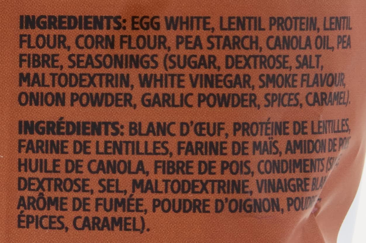 Ingredients: Egg White, Lentil Protein, Lentil Flour, Rice Flour, Pea Starch, High Oleic Sunflower Oil, Pea Fibre, Seasonings (Sugar, Dextrose, Salt, Maltodextrin, White Vinegar, Smoke Flavour, Onion Powder, Garlic Powder, Spices, Caramel)