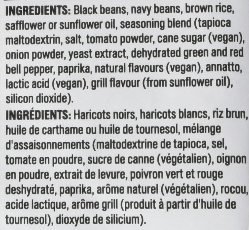 Ingredients: Black and Navy Beans (50%), Organic Brown Rice (13%), Brown Rice (12%), Sunflower or Sunflower Oil, Flavouring (8% Tapioca Maltodextrin, Sea Salt, Tomato Powder, Cane Sugar (Vegan), Onion Powder, Yeast Extract, Paprika, Green Bell Powder, natural Non-dairy Flavor, Extractives of Annato, Lactic Acid, Calcium Lactate, Grill Flavor (From Sunflower Oil)).