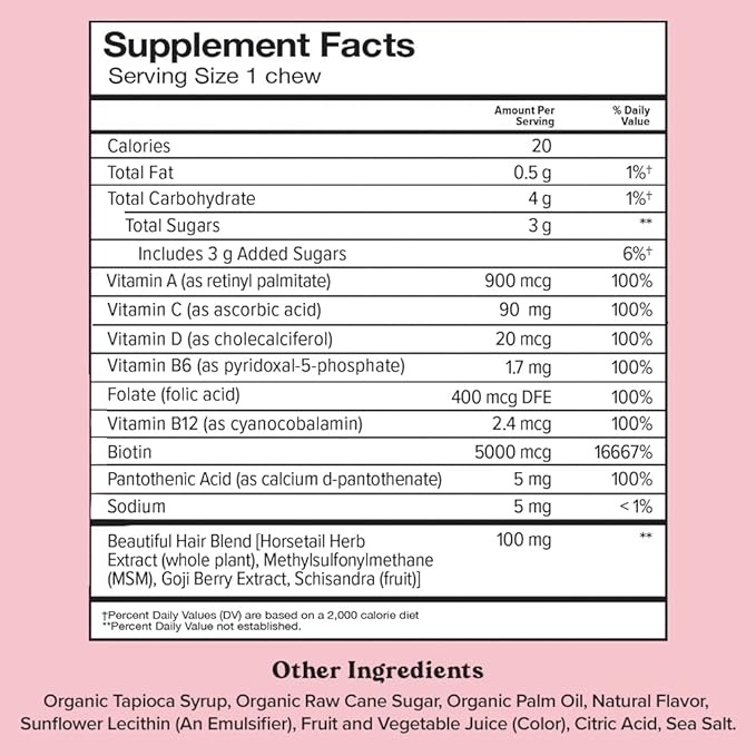 - These naturally flavored Sweet Raspberry chews contain all the key nutrients you need to nourish your hair from within, to make it stronger and fuller, including Biotin, Vitamins A, Vitamin B6, Vitamin B12, Vitamin C, Vitamin D3, Folate, Pantothenic Acid, Horsetail Herb Extract, MSM, Schisandra Fruit Powder and Goji Berry!