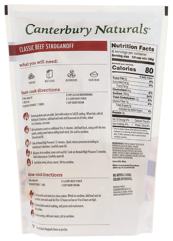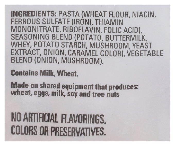 Ingredients: Pasta (Wheat Flour, Niacin, Ferrous Sulfate (Iron), Thiamin Mononitrate, Riboflavin, Folic Acid), Seasoning Blend (Potato, Buttermilk, Whey, Potato Starch, Mushroom, Yeast Extract, Onion, Caramel Color), Vegetable Blend (Onion, Mushroom). Contains: Milk, Wheat.