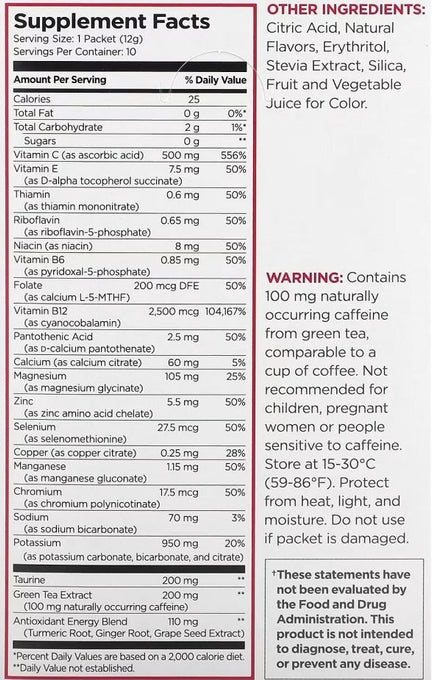 A healthy, antioxidant energy drink mix made with natural flavors, colors and sweeteners. No Sugar. No Sucralose. Non-GMO. Mix with water for an immediate effervescent boost any time of day.