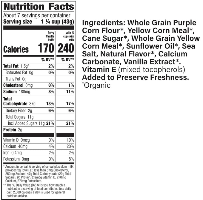 Ingredients: Whole Grain Purple Corn Flour*, Yellow Corn Meal*, Cane Sugar*, Whole Grain Yellow Corn Meal*, Sunflower Oil*, Sea Salt, Natural Flavor*, Calcium Carbonate, Vanilla Extract*. Vitamin E (mixed tocopherols) Added to Preserve Freshness. *Organic