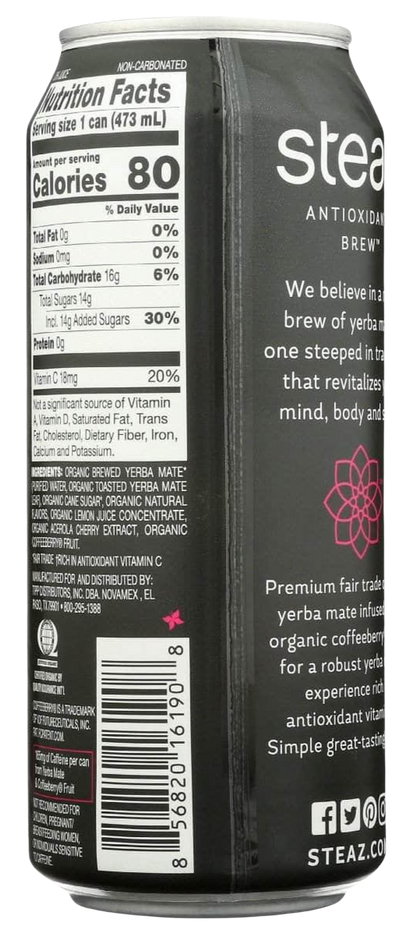 Ingredients: Organic Brewed Yerba Mate* (Purified Water, Organic Toasted Yerba Mate Leaf), Organic Cane Sugar*, Organic Natural Flavors, Organic Lemon Juice Concentrate, Organic Acerola Cherry Extract, Organic Coffeeberry® Fruit.