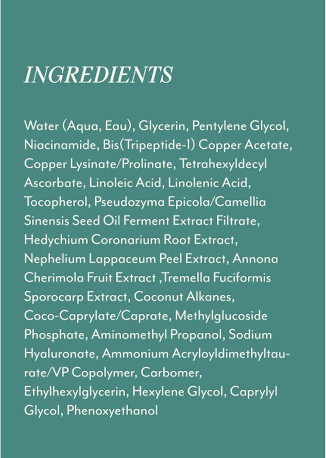 Ingredients: Water (Aqua, Eau), Glycerin,pentylene Glycol,niacinamide, Bis(Tripeptide-1) Copper Acetate, Copper Lysinate/prolinate, Tetrahexyldecyl Ascorbate, Linoleic Acid, Linolenic Acid, Tocopherol, Pseudozyma Epicola/camellia Sinensis Seed Oil Ferment Extract Filtrate,hedychium Coronarium Root Extract, Nephelium Lappaceum Peel Extract, Annona Cherimola Fruit Extract, Tremella Fuciformis Sporocarp Extract, Coconut Alkanes, Coco-caprylate/caprate, Methylglucoside Phosphate, Aminomethyl Propanol, Sodium Hyaluronate, Ammonium Acryloyldimethyltaurate/vp Copolymer, Carbomer, Ethylhexylglycerin, Hexylene Glycol, Caprylyl Glycol, Phenoxyethanol.