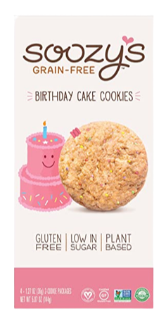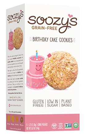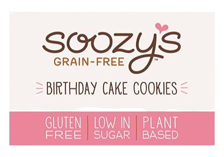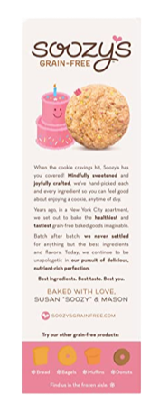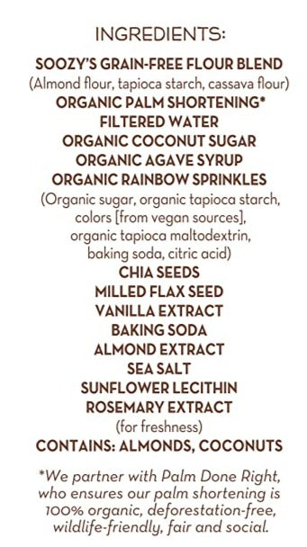 Ingredients: Soozy's Grain-free Flour Blend (Almond Flour, Tapioca Starch, Cassava Flour) Organic Palm Shortening Filtered Water Organic Coconut Sugar Organic Agave Syrup Rainbow Sprinkles (Sugar, Potato Starch, Vegetable Fat (Olive), Maltodextrin, Beet Powder, Spirulina Extract, Turmeric , Paprika, Vegetable Juice) Chia Seeds Vanilla Extract Baking Soda Sea Salt Sunflower Lecithin Rosemary Extract (For Freshness)