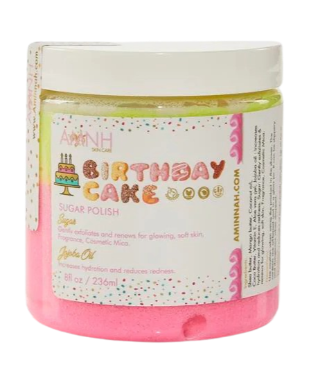 The Birthday Cake Sugar Scrub by Aminnah is a delightful treat for your skin, made with real sugar and natural ingredients.