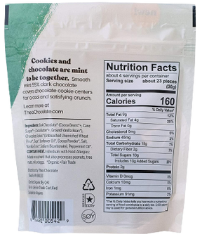 Ingredients: Dark Chocolate* (Cocoa Beans*+, Cane Sugar*+, Cocoa Butter*+, Ground Vanilla Bean*), Chocolate Cookies* (Unbleached Unenriched Wheat Flour*, Sugar*, Sunflower Oil*, Cocoa Powder*, Salt, Vanilla Extract*, Sodium Bicarbonate), Peppermint Oil*.
